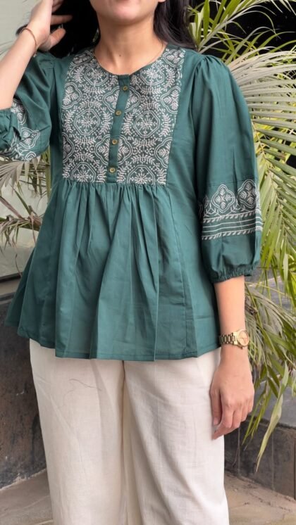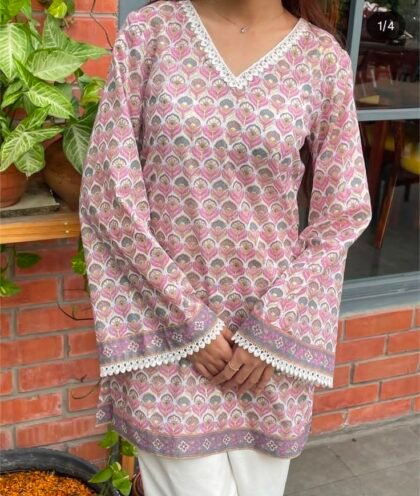A beautiful pink and white long kurti featuring an elegant geometric block print pattern. Designed with a V-neckline and three-quarter sleeves, it offers a flattering straight-cut silhouette with side slits for comfort and style. Crafted from soft, breathable cotton fabric, this kurti is perfect for casual outings, office wear, or festive occasions when paired with palazzos or leggings.